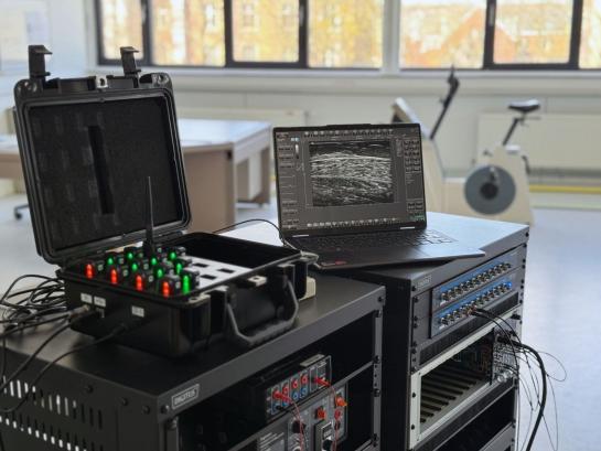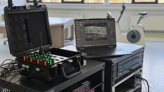 - Multiple Telemed ArtUS systems with veterinary (flat) transducers enable high-speed dynamic imaging of muscles and tendons (up to 150 fps). Two Usono Probefix devices allow secure transducer attachment to limbs during dynamic movements, ensuring stable and repeatable imaging.