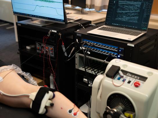 We use a broad range of techniques to study the biomechanics and neuromechanics of movement and muscle contraction. Our laboratory, located on the VUB Main Campus, includes extensive space for diverse movement analyses and is equipped with dedicated, state-of-the-art neuromechanical instruments. All measurement systems are fully time-synchronized to ensure precise data integration.